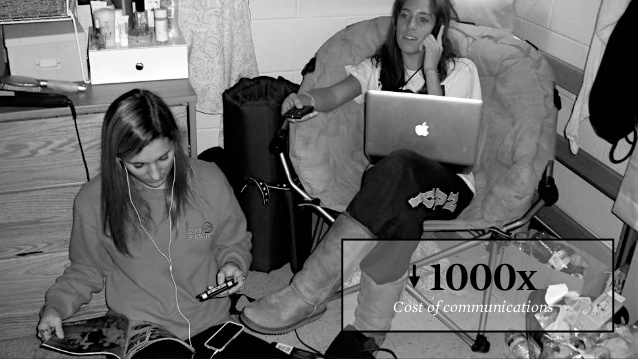 – The cost of communication is down by a thousand times. Here you can see a typical picture of two college girls who are extremely focused on other things than themselves. You can see a clear change in peoples behaviour.