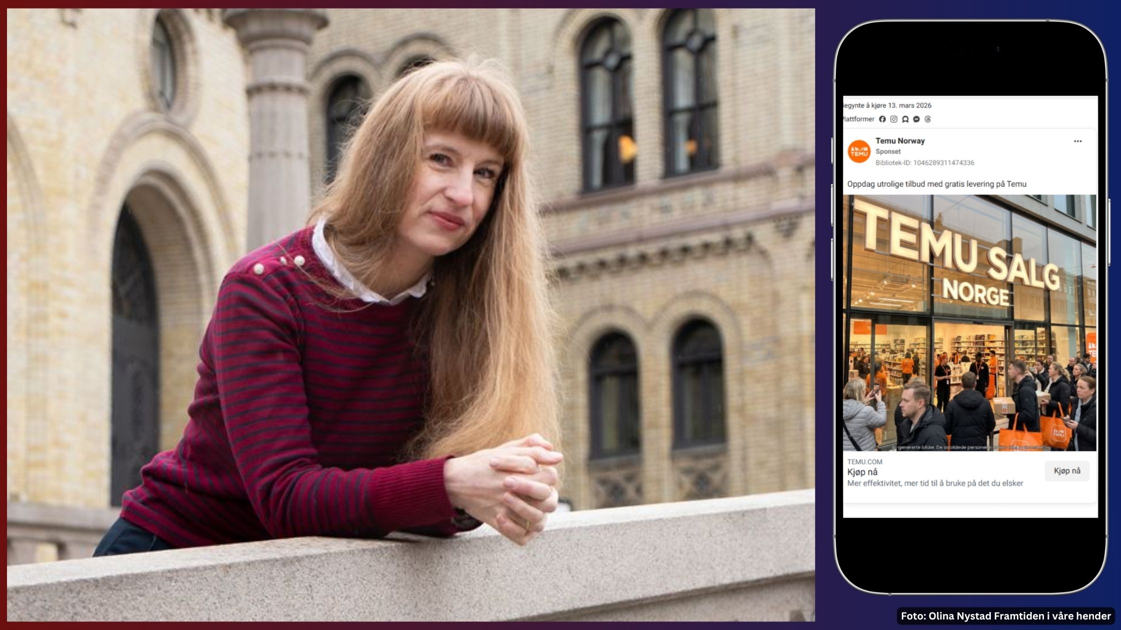 – Temu kjører nå en annonsekampanje i Norge som gir inntrykk av at de er et norsk selskap med butikker og lager her til lands. Det stemmer ikke. Bildene er KI-genererte, og Temu har verken kontor, butikk eller registrering i Norge. Dette er etter vår vurdering villedende markedsføring i strid med loven, sier Tale Hungnes, leder i Framtiden i våre hender.